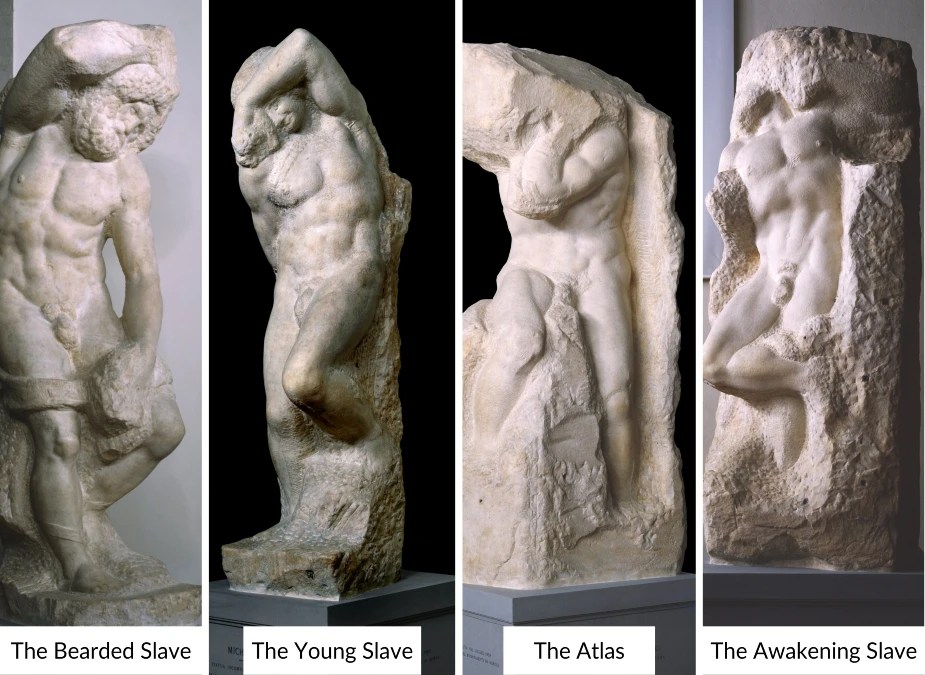 [Above] Michelangelo’s four legendary statues at the Academia Gallery in Florence, which line the hall approaching the Statue of David. They represent some of the best examples of the iconic artist’s customary working practice of carving out the figures from blocks of marble as well as symbolic of man’s constant struggle to free the spirit from matter. [Below] Michelangelo’s David.