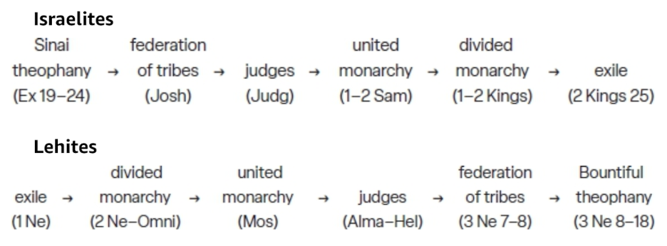 For anyone familiar with the Bible, the Nephite shift from the reign of kings to the reign of judges is a striking contrast to the Israelite story, but additional parallels are notable. The biblical period of divided monarchy, when Israel and Judah were separate kingdoms, is mirrored by the disparate lines of kings among the Nephites and the Mulekites (also led, respectively, by the tribes of Joseph and Judah). In both cases, the era of united monarchy lasts for just three kings: Saul, David, and Solomon are paralleled by Mosiah1, Benjamin, and Mosiah2. The sin cycle in Judges is reflected by the pride cycle in Helaman and 3 Nephi. And the climactic moment of the Book of Mormon, that is, Christ’s post-resurrection visit, returns the Lehite/Mulekite Israelites into God’s presence as he fulfills the law given at Sinai, thus imparting a balanced, satisfying arc to the Lord’s covenantal relationship with this branch of his chosen people. Grant Hardy, Annotated BM